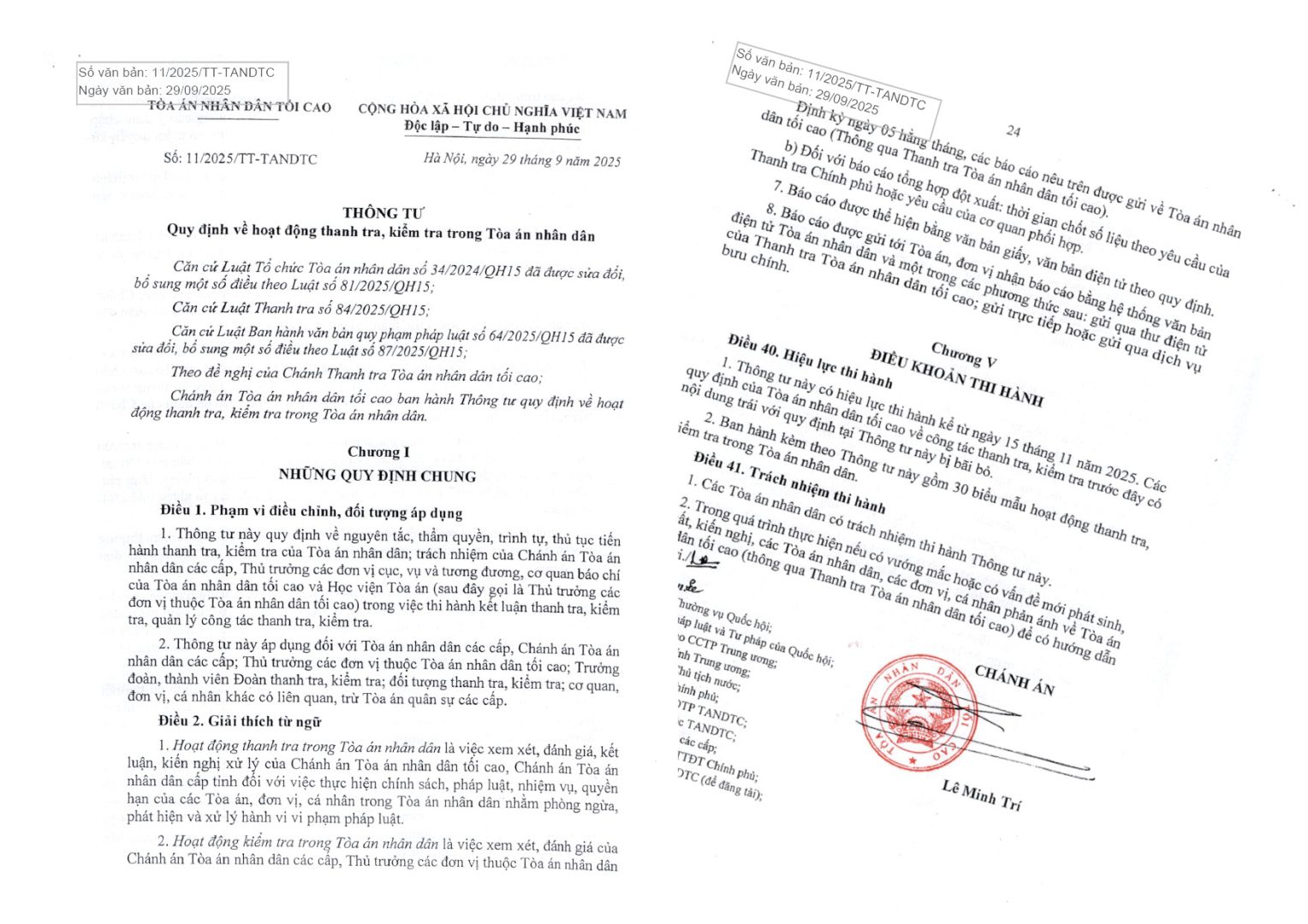 Ngày 29/9/2025, Chánh án Tòa án nhân dân tối cao ban hành Thông tư số 11/2025/TT-TANDTC quy định về tổ chức, quản lý, điều hành và hoạt động trong các Tòa án nhân dân. Thông tư này là bước tiến quan trọng trong việc chuẩn hóa hoạt động nội bộ, nâng cao hiệu lực, hiệu quả công tác xét xử, đáp ứng yêu cầu cải cách tư pháp và xây dựng nền tư pháp chuyên nghiệp, hiện đại, liêm chính.