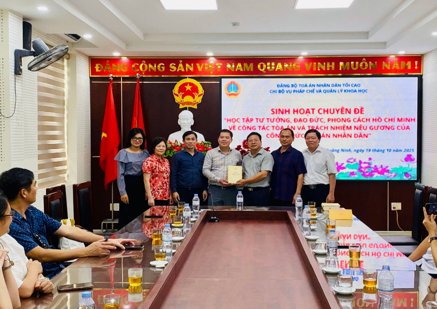 Cũng trong chương trình, đoàn đã có buổi giao lưu, trao đổi với Tòa án nhân dân khu vực 5, tỉnh Quảng Ninh. Hai đơn vị chia sẻ nhiều kinh nghiệm thực tiễn trong công tác chuyên môn, hoạt động đoàn thể và phong trào thi đua. Nhân dịp này, Vụ Pháp chế và Quản lý khoa học đã trao tặng 20 cuốn Án lệ Việt Nam (xuất bản năm 2025), góp phần lan tỏa văn hóa nghiên cứu, ứng dụng án lệ trong xét xử, đồng thời tăng cường hỗ trợ nghiệp vụ giữa các đơn vị trong hệ thống Tòa án.