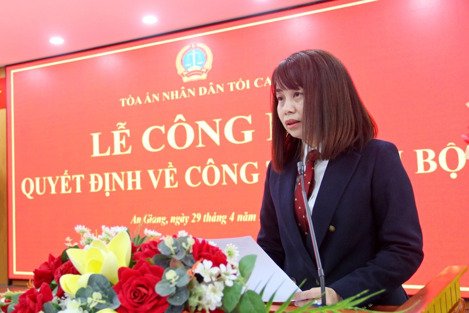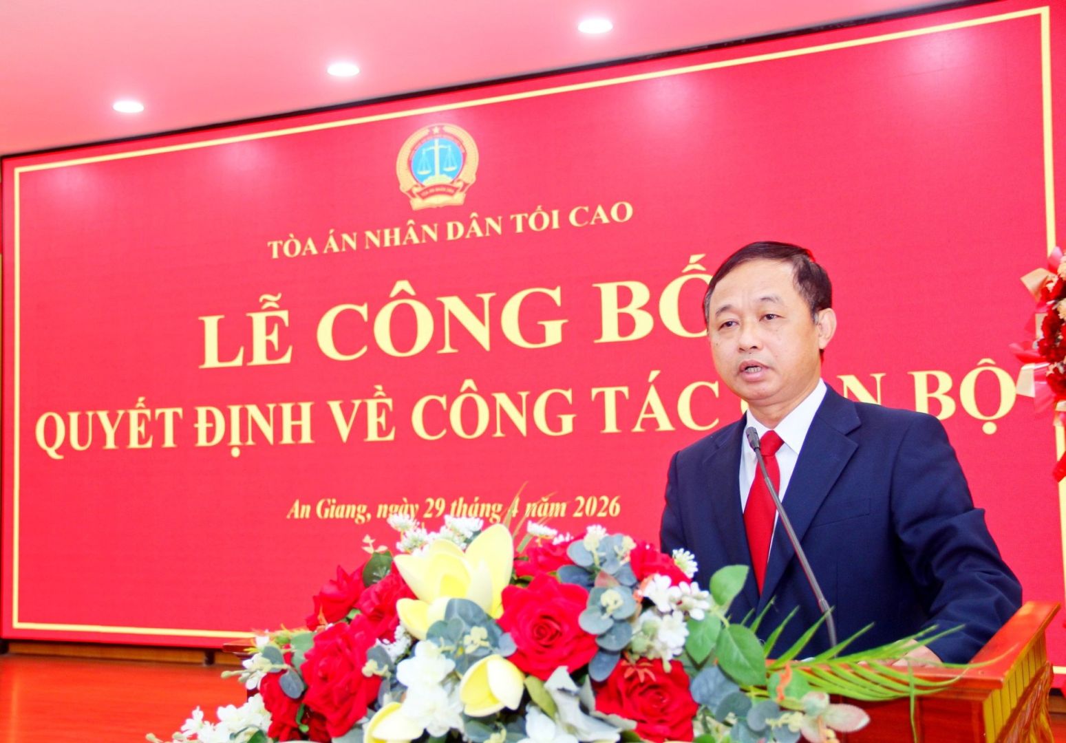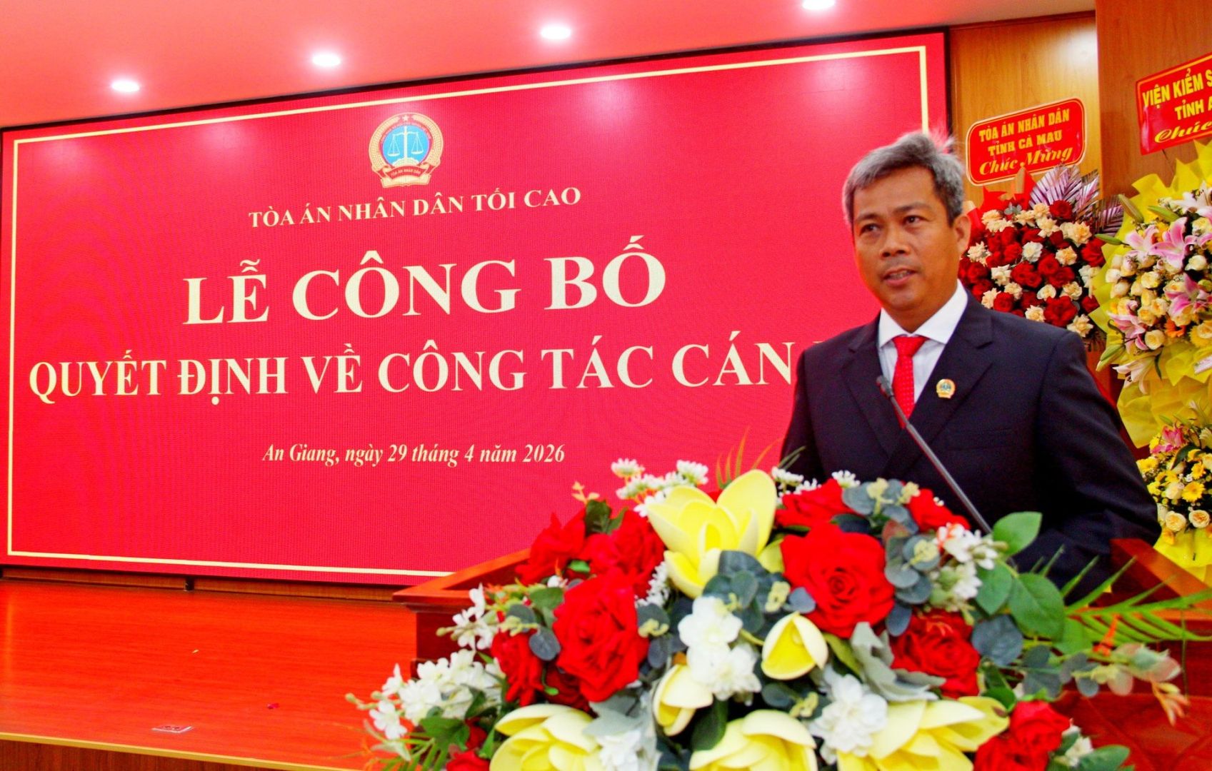 Tại buổi lễ, thừa ủy quyền của Chánh án TANDTC, đồng chí Trịnh Thị Thu Phương, Phó Vụ trưởng Vụ Tổ chức - Cán bộ TANDTC đã công bố quyết định về việc điều động, bổ nhiệm đồng chí Thái Rết, Chánh án TAND tỉnh Cà Mau, giữ chức vụ Chánh án TAND tỉnh An Giang. Thời hạn giữ chức vụ là 5 năm, kể từ ngày 1/5/2026.