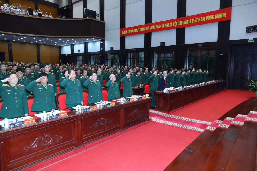 Các đồng chí lãnh đạo, nguyên lãnh đạo Bộ Quốc phòng và các đại biểu dự lễ khai mạc và tham gia bầu cử tại Hội trường Bộ Quốc phòng, khu vực bầu cử số 14, phường Ba Đình, TP Hà Nội