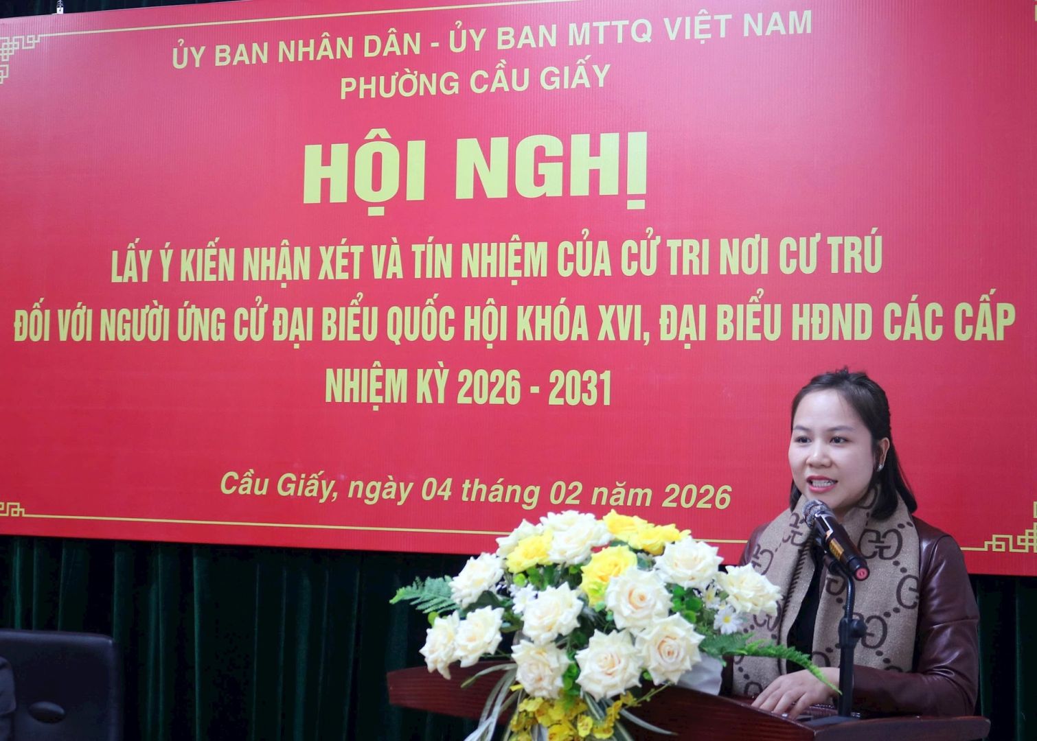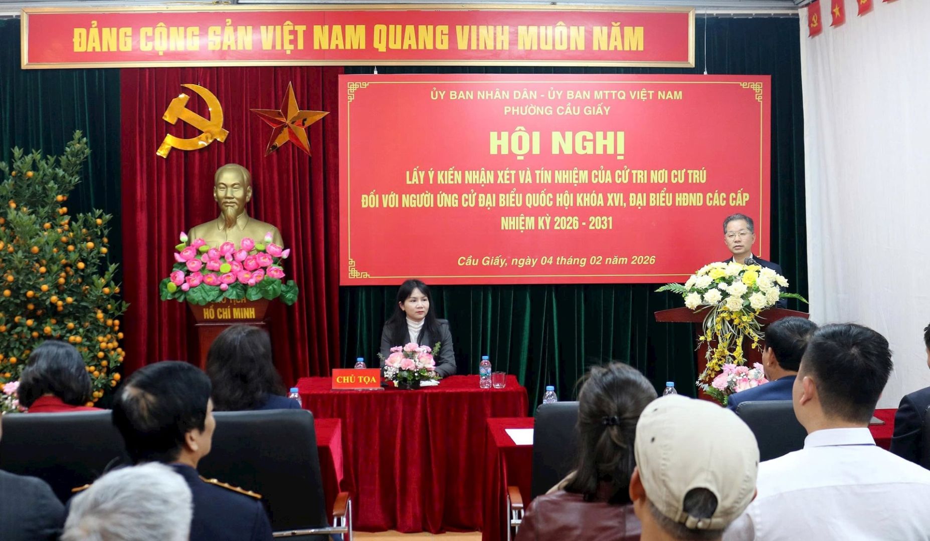 Chiều 04/02, Ban Thường trực Ủy ban Mặt trận Tổ quốc Việt Nam phường Cầu Giấy phối hợp với UBND phường Cầu Giấy, thành phố Hà Nội tổ chức hội nghị lấy ý kiến nhận xét và tín nhiệm của cử tri nơi cư trú đối với người ứng cử đại biểu Quốc hội khóa XVI và đại biểu Hội đồng nhân dân (HĐND) các cấp nhiệm kỳ 2026-2031.