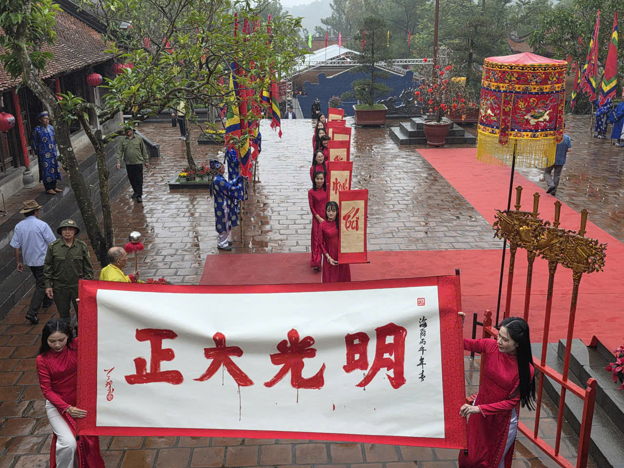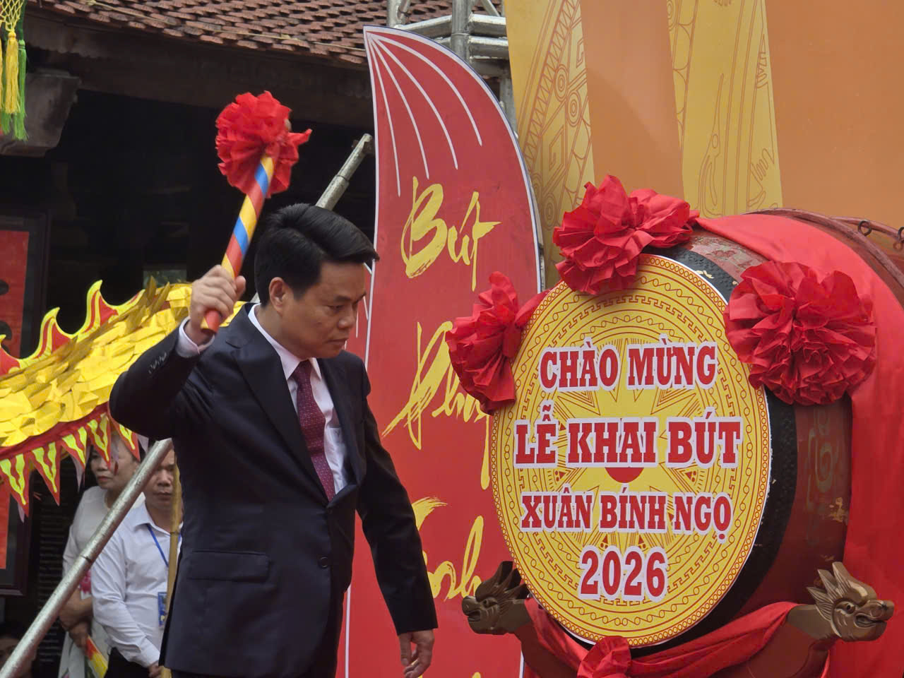 Lễ khai bút Xuân Bính Ngọ năm nay diễn ra với nhiều nghi thức truyền thống: cung tuyên văn tế tri ân danh nhân; khởi trống khai bút; trình diễn thư pháp Hán văn với bốn chữ “Chính đại quang minh” – biểu trưng cho đường lối ngay thẳng, sáng suốt, vì dân vì nước; khai bút chữ Quốc ngữ với bảy chữ “Trí – Minh – An – Khang – Vinh – Thịnh – Phúc”, gửi gắm ước vọng về trí tuệ, sức khỏe, thịnh vượng trong năm mới.