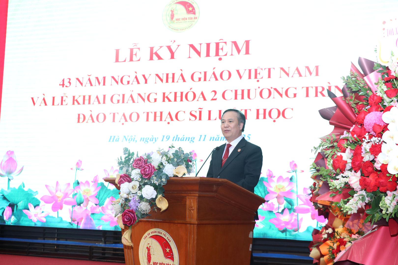Phát biểu chỉ đạo tại buổi Lễ, đồng chí Phạm Quốc Hưng, Phó Chánh án TANDTC gửi lời chúc mừng tốt đẹp cùng lòng biết ơn sâu sắc vì những đóng góp bền bỉ, tận tâm của tập thể lãnh đạo, giảng viên HVTA. Đồng thời, đánh giá cao những nỗ lực của học viện Tòa án trong thời gian vừa qua, từ đổi mới chương trình đào tạo, chuẩn hóa đội ngũ giảng viên, đẩy mạnh nghiên cứu khoa học, tăng cường ứng dụng công nghệ, cho đến việc mở rộng hợp tác quốc tế, tiếp cận các mô hình đào tạo tư pháp tiên tiến trên thế giới.