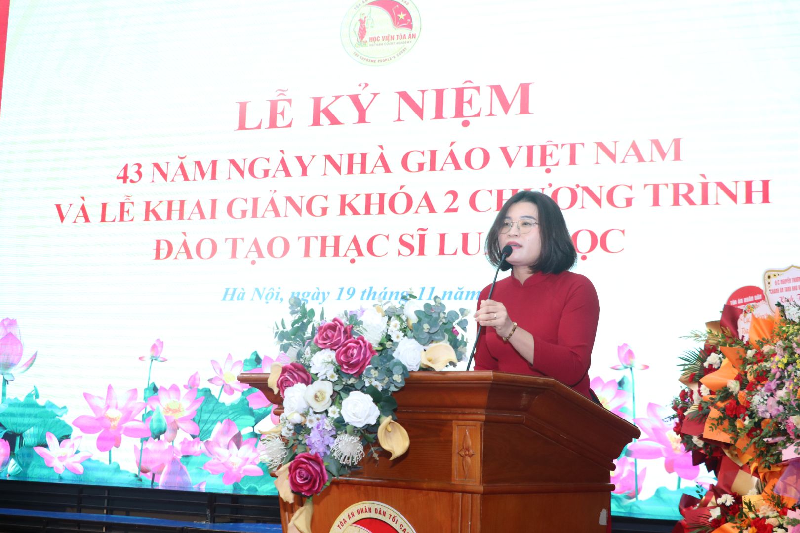 Đồng chí Phó Chánh án cho biết, trải qua 43 năm, ngành Nhà giáo Việt Nam đã trở thành biểu tượng của đạo lý tôn sư trọng đạo, một truyền thống quý báu làm nên bản sắc văn hóa dân tộc. Đối với ngành Tòa án, truyền thống ấy càng có ý nghĩa đặc biệt, gắn với nhiệm vụ bảo vệ công lý, bảo vệ quyền con người, quyền công dân; đòi hỏi những cán bộ Thẩm phán phải được đào tạo, rèn luyện nền tảng tri thức pháp luật vững chắc, phương pháp tư duy khoa học và phẩm chất đạo đức trong sáng; những giá trị này chỉ có thể được đúc kết và truyền tải bởi chính những người thầy thầm lặng, miệt mài gieo tri thức.