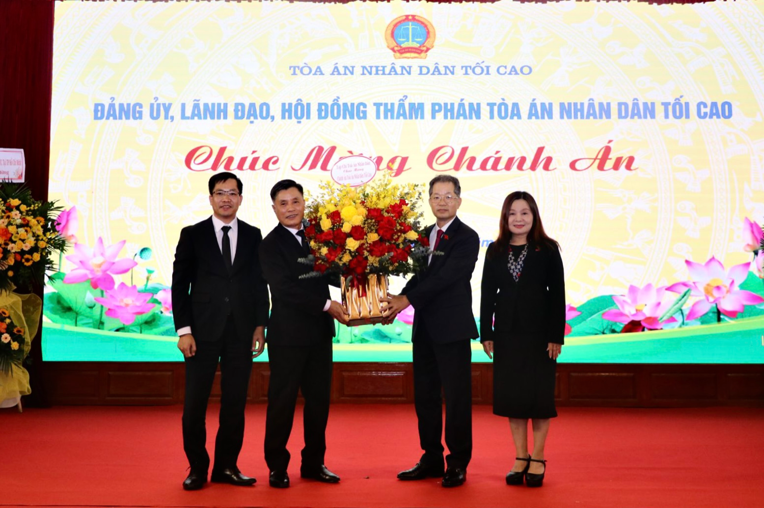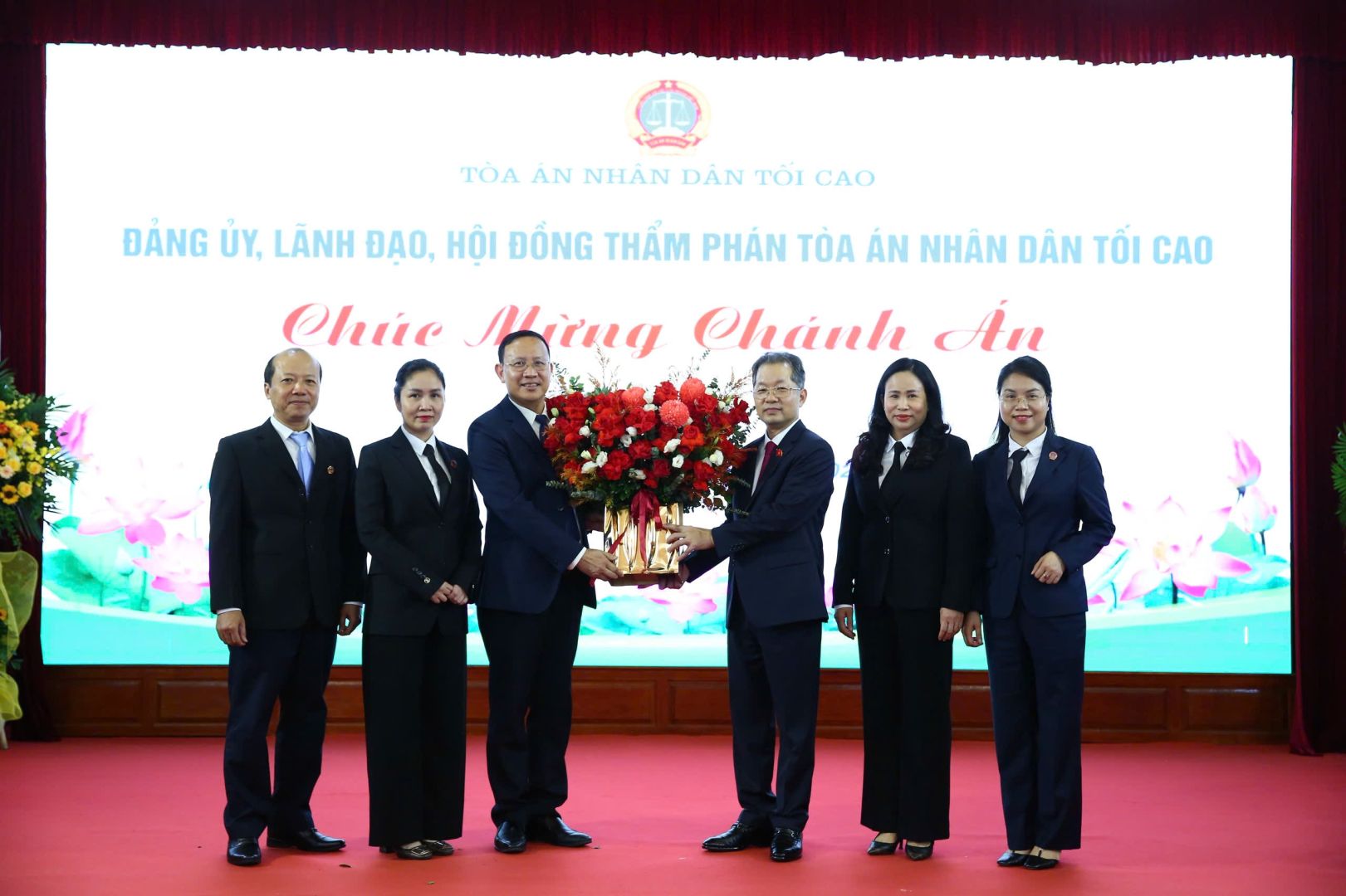 Thủ trưởng, đại diện lãnh đạo các đơn vị thuộc TANDTC tặng hoa chúc mừng Chánh án TANDTC Nguyễn Văn Quảng.