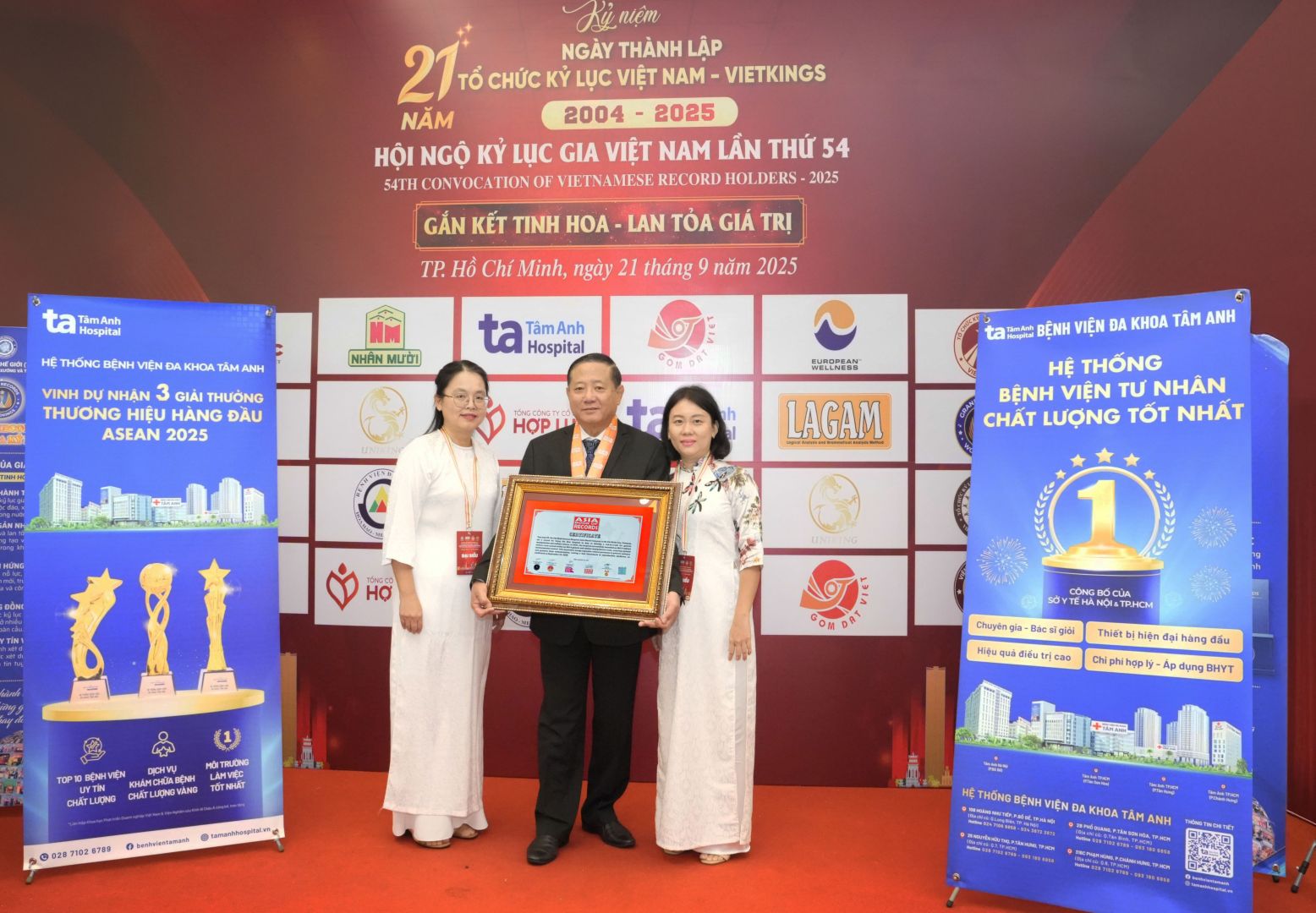 Đại diện BVĐK Tâm Anh, gồm PGS.TS.BS Trần Quang Bính - Giám đốc Chuyên môn, ThS.BS Giang Huỳnh Như - Giám đốc Trung tâm Hỗ trợ sinh sản, Thạc sĩ Nguyễn Ngọc Quỳnh - Trưởng lab, đã vinh dự nhận Kỷ lục châu Á và Kỷ lục Việt Nam. Ảnh: Thanh Luận