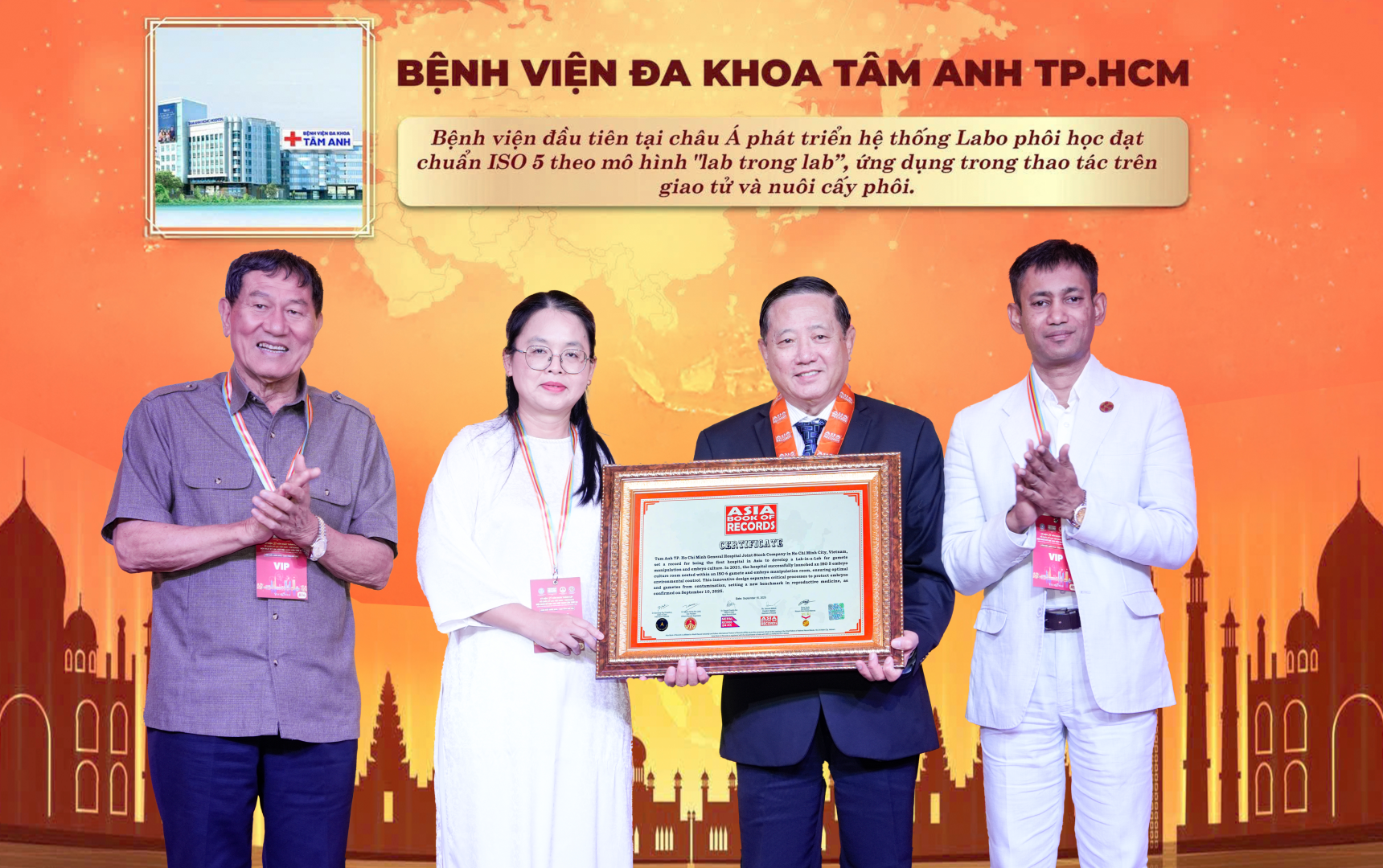 Ngày 21/9, Bệnh viện Đa khoa Tâm Anh TP.HCM vừa vinh dự đón nhận Kỷ lục châu Á cho "Bệnh viện đầu tiên có Hệ thống Lab phôi học đạt chuẩn ISO 5 theo mô hình “lab trong lab”, ứng dụng trong thao tác trên giao tử và nuôi cấy phôi".