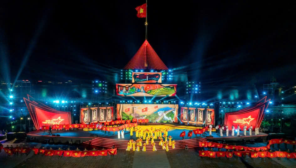 Chương trình chính luận nghệ thuật “Dưới cờ vinh quang” tại điểm cầu Thành phố Hồ Chí Minh. Ảnh: Lê Hoàng