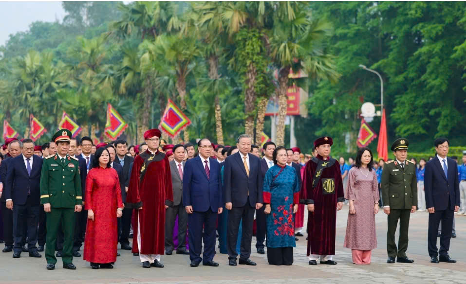 Tiếp đó, thay mặt đồng bào và nhân dân cả nước, Tổng bí thư, Chủ tịch nước Tô Lâm cùng đại diện lãnh đạo, nguyên lãnh đạo Đảng, Nhà nước và tỉnh Phú Thọ vào Thượng cung và Lăng Hùng Vương dâng hương, dâng hoa bày tỏ lòng biết ơn sâu sắc các bậc tiền nhân đã có công dựng nước để con cháu nối tiếp truyền thống Lạc Hồng, xây dựng đất nước Việt Nam giàu đẹp, văn minh như ngày hôm nay.