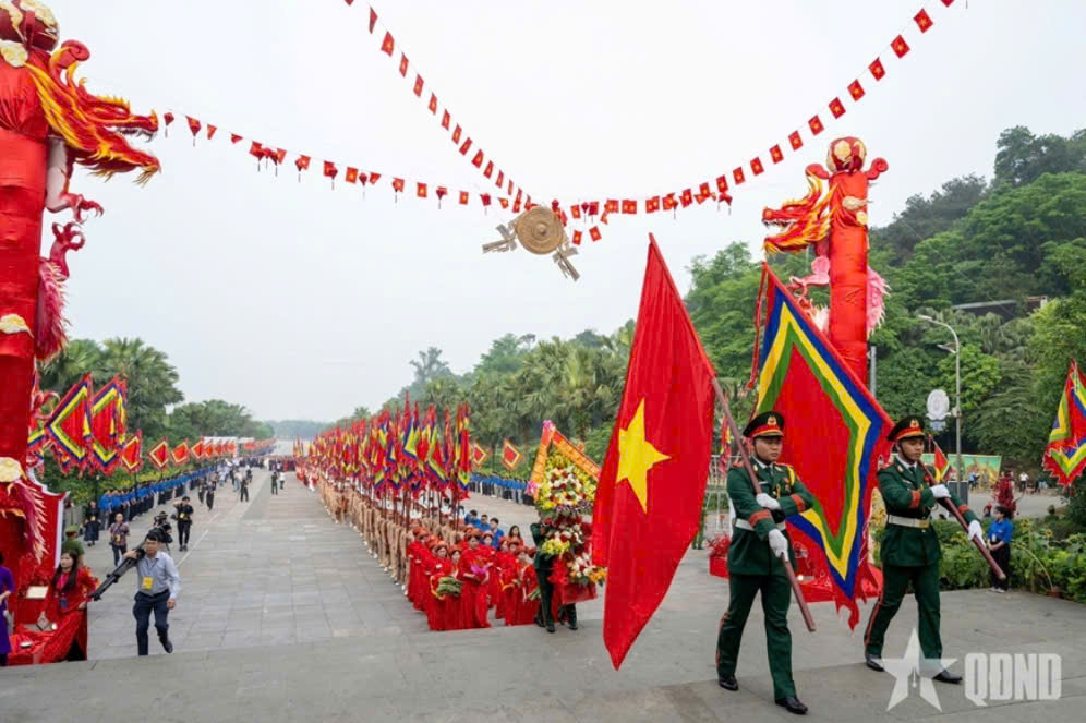 Đoàn dâng hương khởi hành lên đền Thượng. Nguồn ảnh: Báo QĐND