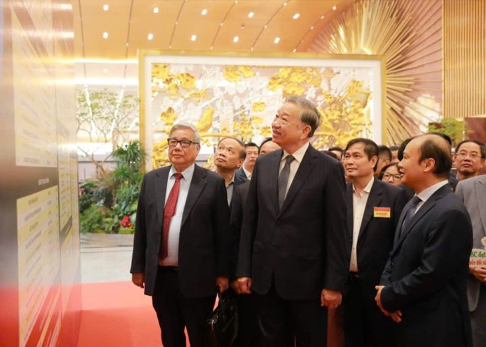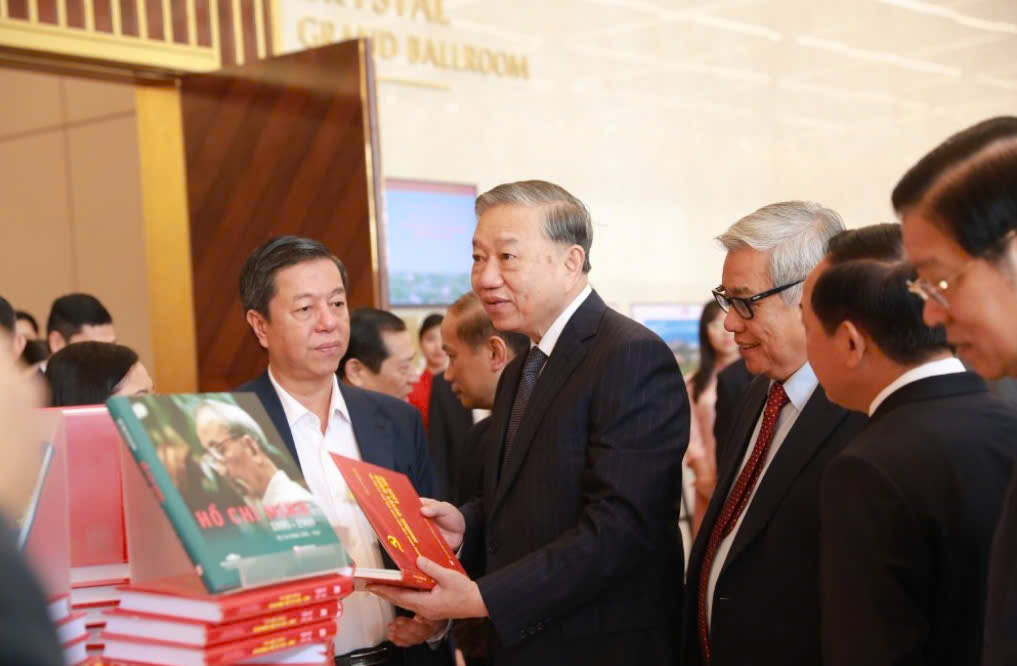 Tổng Bí thư Tô Lâm và các đại biểu tham quan khu vực trưng bày sách tại Hội nghị. Ảnh: Trần Vương