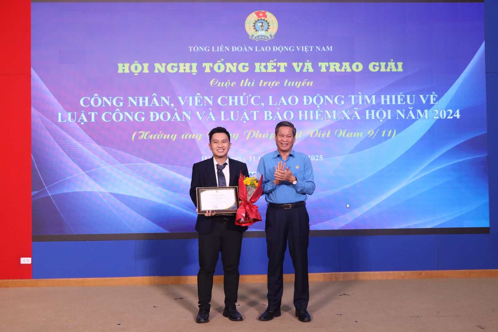 Sáng 11/11, tại Hà Nội, Tổng Liên đoàn Lao động Việt Nam (LĐLĐVN) tổ chức Hội nghị tổng kết và trao giải Cuộc thi trực tuyến “Công nhân, viên chức, lao động tìm hiểu về Luật Công đoàn và Luật Bảo hiểm xã hội 2024”.