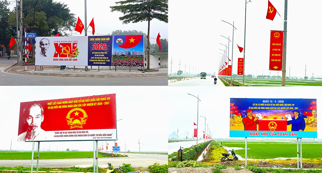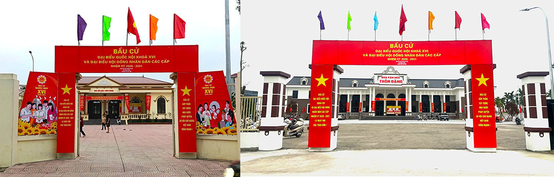 Dọc các tuyến đường chính và tại các nhà văn hóa thôn, cờ Tổ quốc, băng rôn, khẩu hiệu và pano tuyên truyền rực rỡ sắc đỏ. Hệ thống loa truyền thanh xã liên tục cập nhật thông tin, quy định về Luật Bầu cử đến từng hộ gia đình.