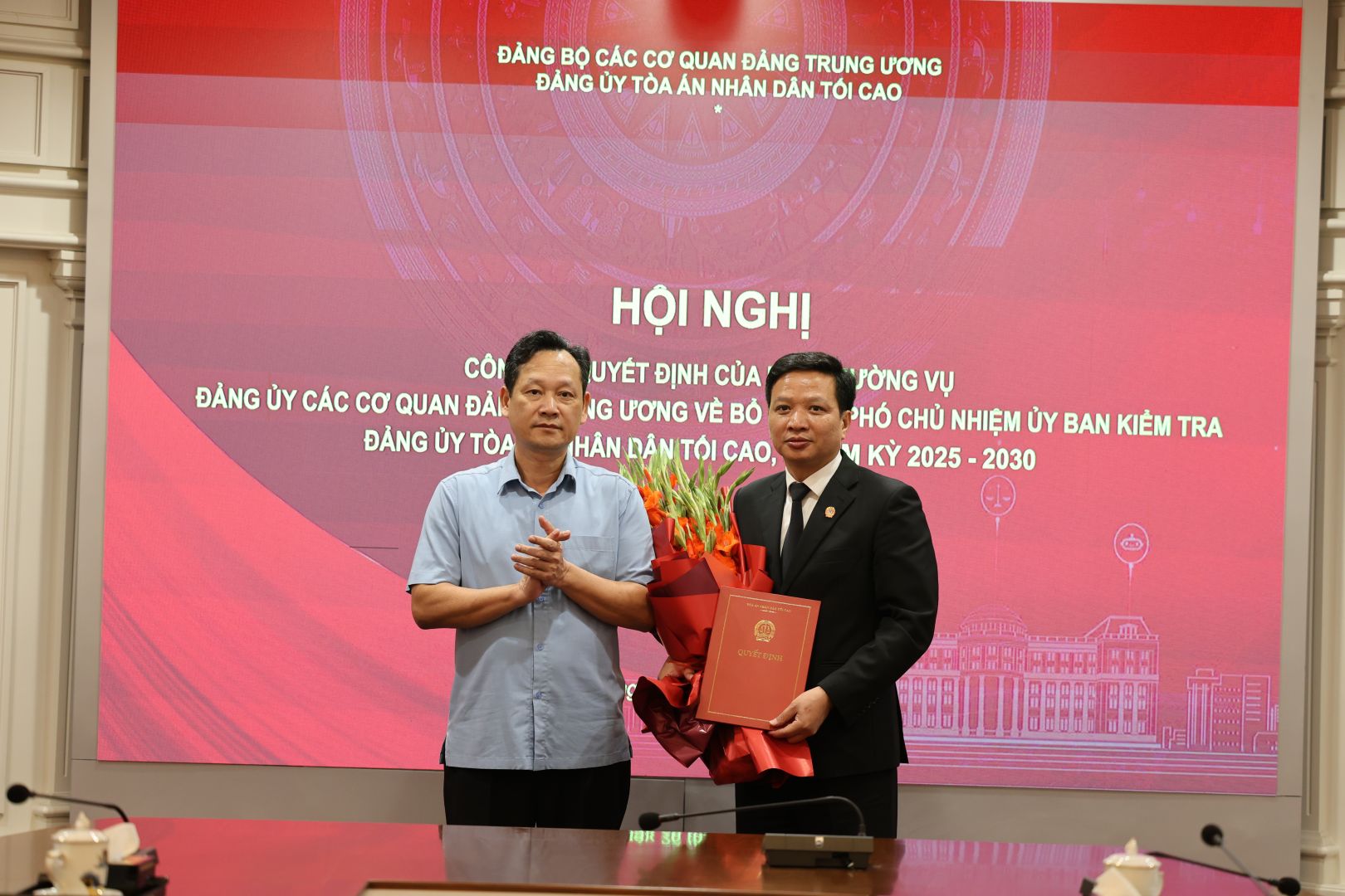 Ủy viên Ban Thường vụ Đảng ủy, Chủ nhiệm Ủy ban Kiểm tra Đảng ủy, Phó Chánh án Tòa án nhân dân tối cao Nguyễn Văn Tiến trao Quyết định chuẩn y chức vụ Phó Chủ nhiệm Ủy ban Kiểm tra Đảng ủy Tòa án nhân dân tối cao đối với đồng chí Nguyễn Văn Minh.