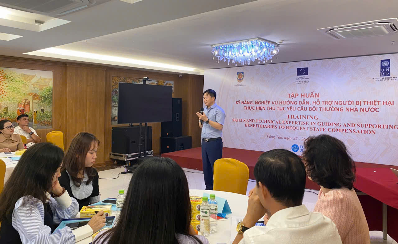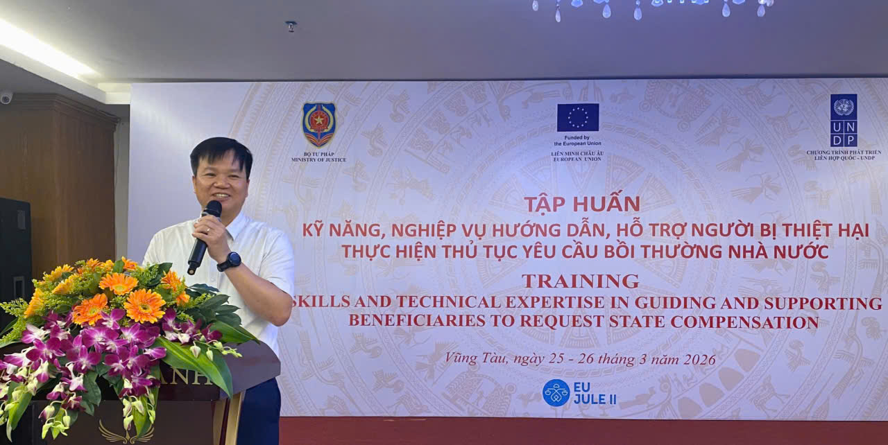Cục Đăng ký giao dịch bảo đảm và Bồi thường nhà nước, Bộ Tư pháp vừa tổ chức chương trình “Tập huấn về kỹ năng, nghiệp vụ hướng dẫn, hỗ trợ người bị thiệt hại thực hiện thủ tục yêu cầu bồi thường nhà nước” tại phường Vũng Tàu, TP HCM. Đây là hoạt động nằm trong khuôn khổ Kế hoạch hoạt động năm 2025 của Dự án Tăng cường pháp luật và tư pháp tại Việt Nam (EU JULE).