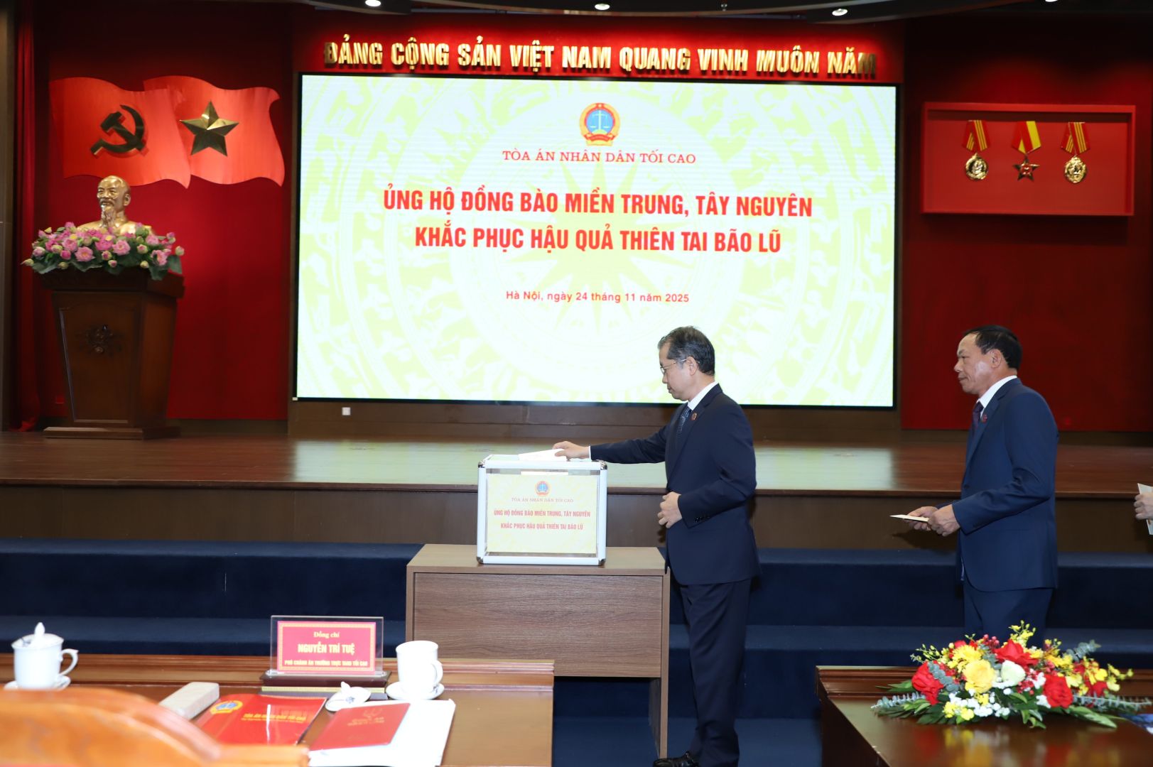 “Mỗi sự đóng góp hôm nay, dù nhỏ bé nhưng cũng sẽ góp phần giúp đồng bào chúng ta có thêm niềm tin, thêm nghị lực để vượt qua khó khăn, sớm ổn định cuộc sống. Sự chung tay của toàn ngành Tòa án sẽ là nguồn động viên tinh thần to lớn đối với nhân dân các vùng bị thiên tai. Đây không chỉ là sự sẻ chia vật chất mà còn biểu hiện sâu sắc của tinh thần đoàn kết, nhân ái - những giá trị tốt đẹp luôn gắn liền với người cán bộ Tòa án”, Phó Chánh án Nguyễn Trí Tuệ phát biểu.