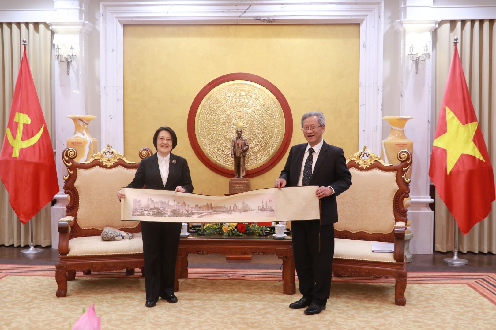 Đại biểu của TANDTC Việt Nam và TAND cấp cao Thượng Hải (Trung Quốc) chụp ảnh và trao các phần quà lưu niệm