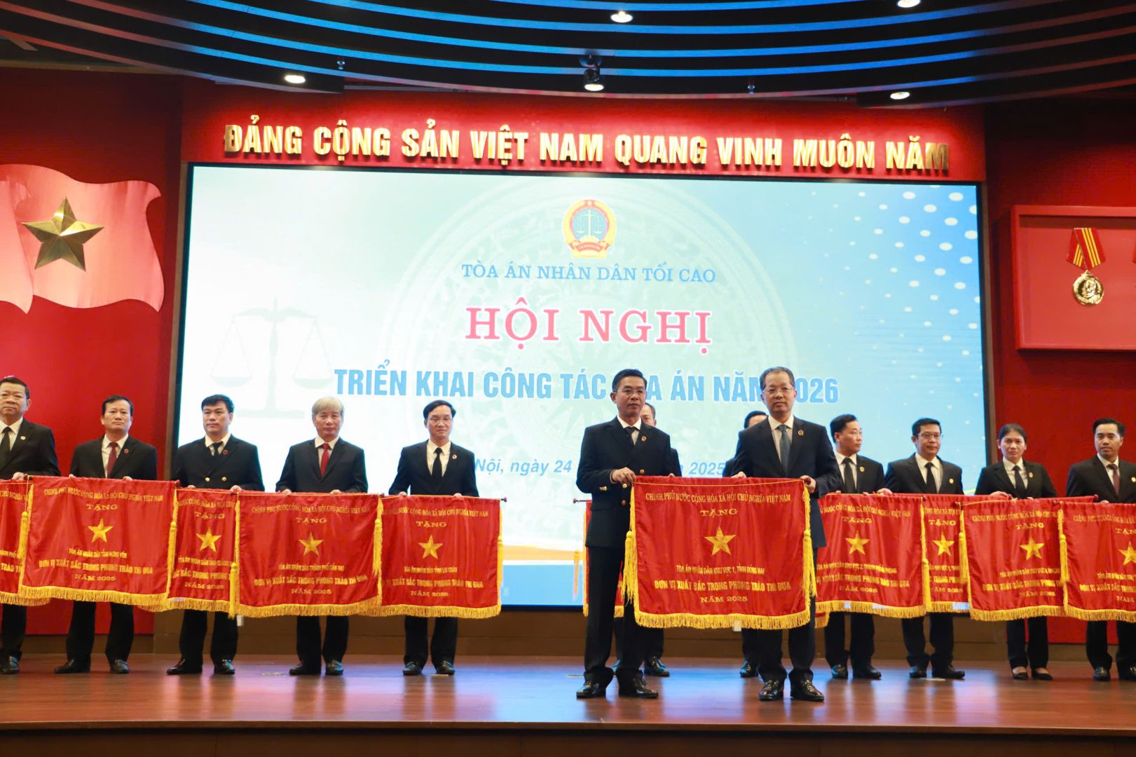 Cán bộ, công chức, viên chức, người lao động Tòa án nhân dân các cấp đoàn kết, sáng tạo, thi đua xây dựng ngành Tòa án nhân dân tinh gọn, chuyên nghiệp, hiện đại, kỷ cương, liêm chính, trong sạch, vững mạnh, hoàn thành xuất sắc nhiệm vụ, tự hào vững bước vào kỷ nguyên mới
