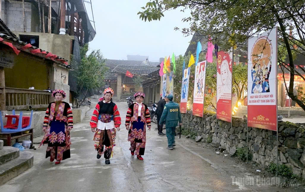 Cử tri thôn Lô Lô Chải, xã Lũng Cú phấn khởi di chuyển đến khu vực bỏ phiếu từ sáng sớm ngày 15/3/2026. Ảnh: Thu Hằng