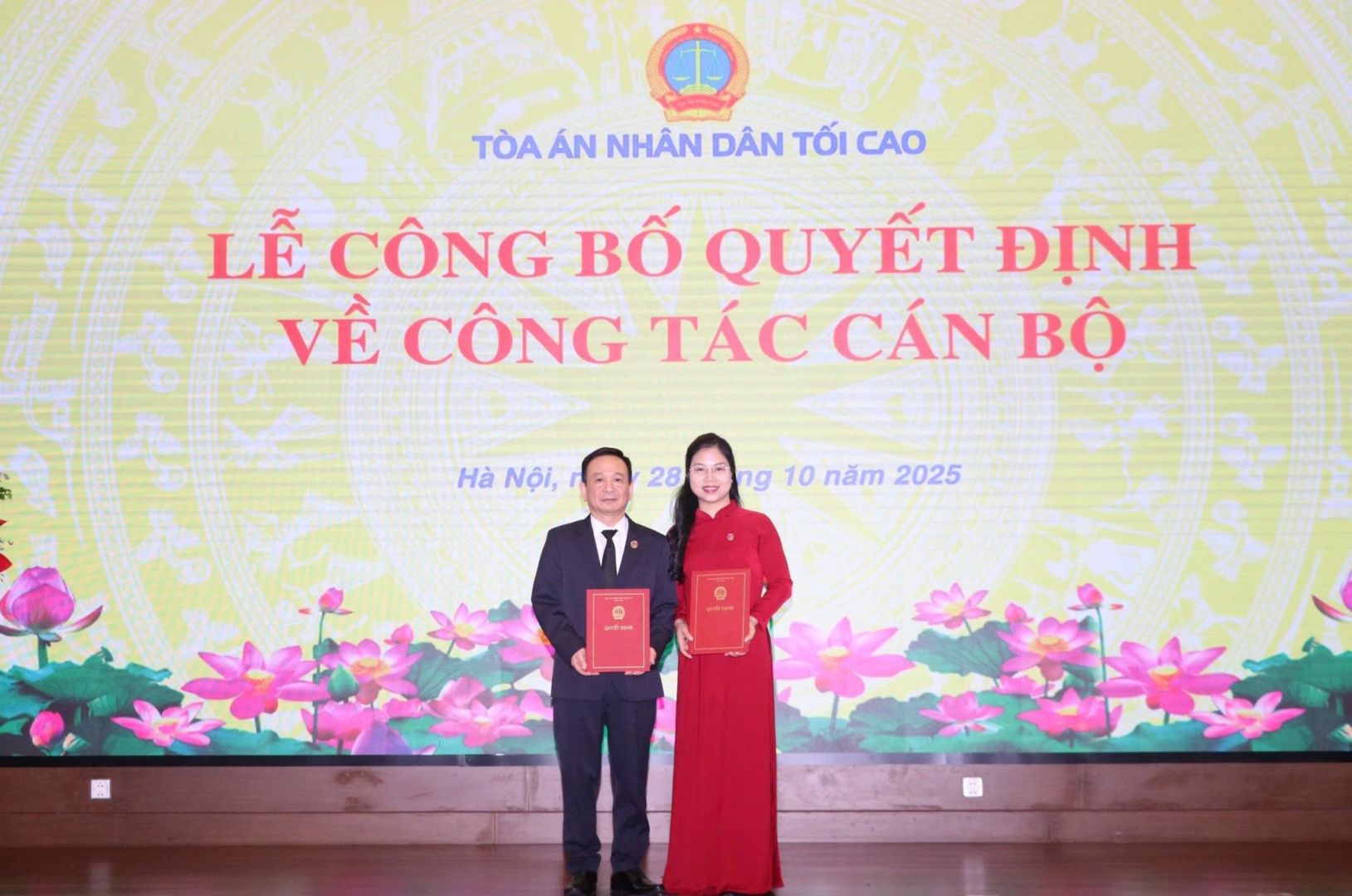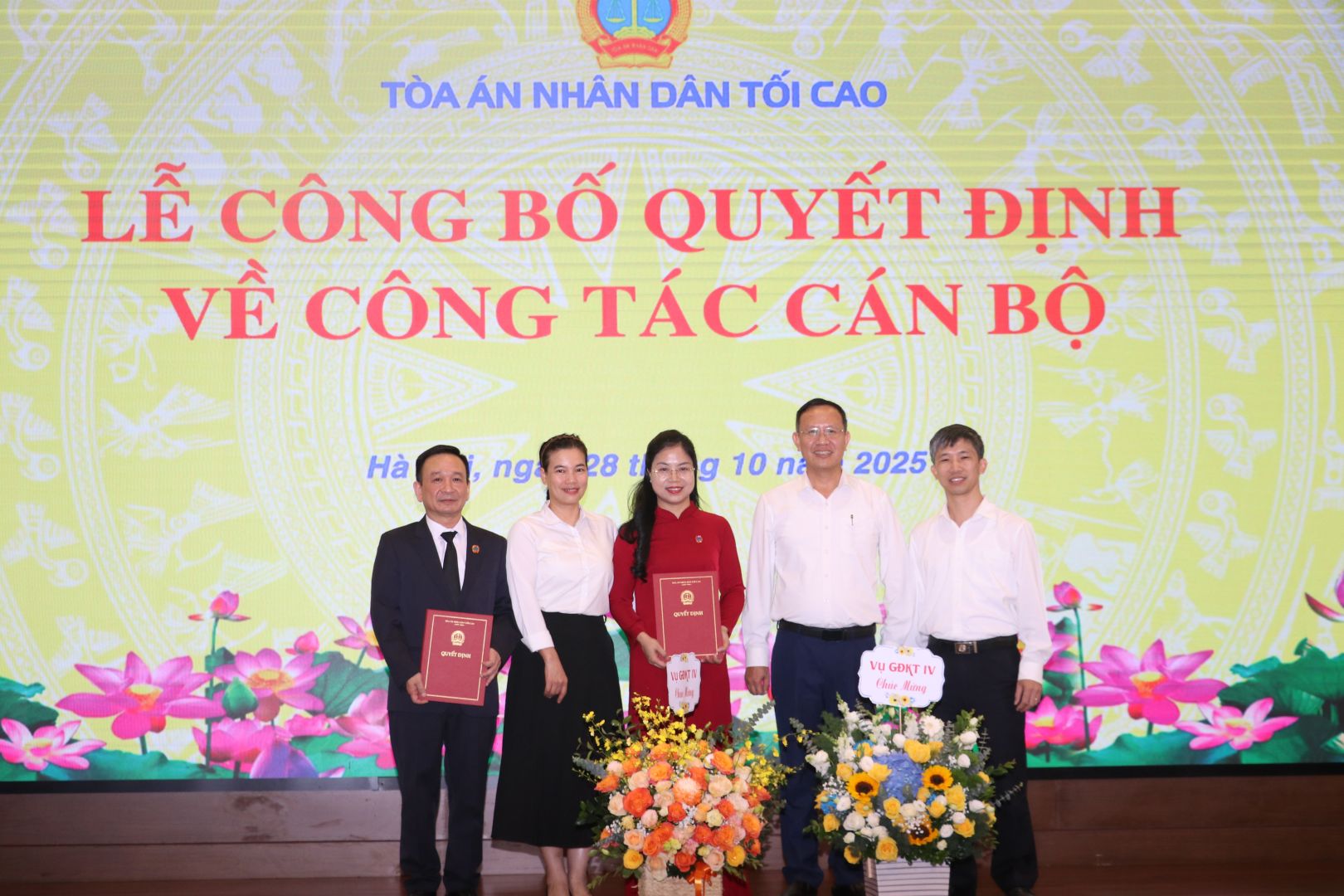 Tại buổi lễ, đồng chí Chu Đức Anh, Vụ trưởng Vụ Tổ chức - Cán bộ TANDTC đã công bố các Quyết định của Chánh án TANDTC về việc điều động và bổ nhiệm đồng chí Nguyễn Thị Hà, Phó Chánh án Tòa án nhân dân thành phố Hà Nội giữ chức vụ Vụ trưởng Vụ Giám đốc, kiểm tra về kinh doanh, thương mại, phá sản, lao động, gia đình và người chưa thành niên TANDTC (Vụ III) và đồng chí Vũ Minh Tuấn, Thẩm phán Tòa án nhân dân bậc 3 Vụ Giám đốc, kiểm tra về dân sự Tòa án nhân dân tối cao giữ chức vụ Phó Vụ trưởng Vụ Giám đốc, kiểm tra về dân sự TANDTC (Vụ II). Quyết định có thời hạn 05 năm, kể từ ngày 1/11/2025.