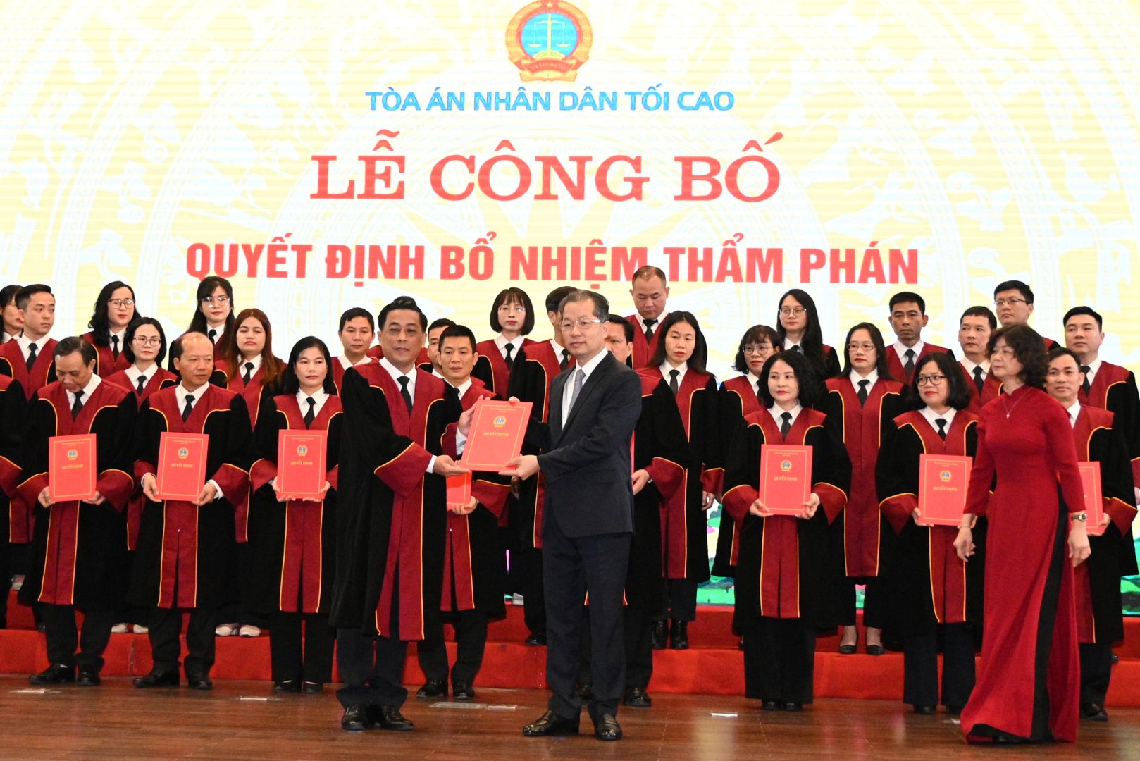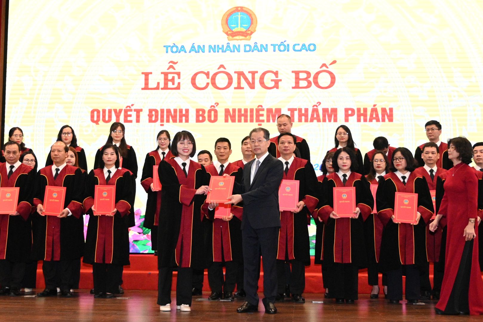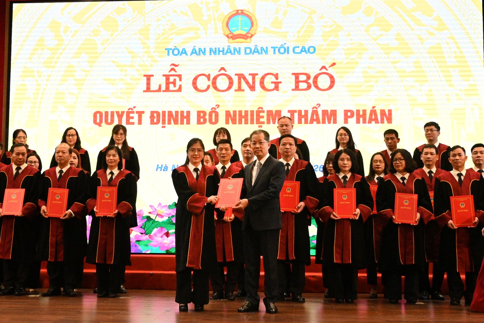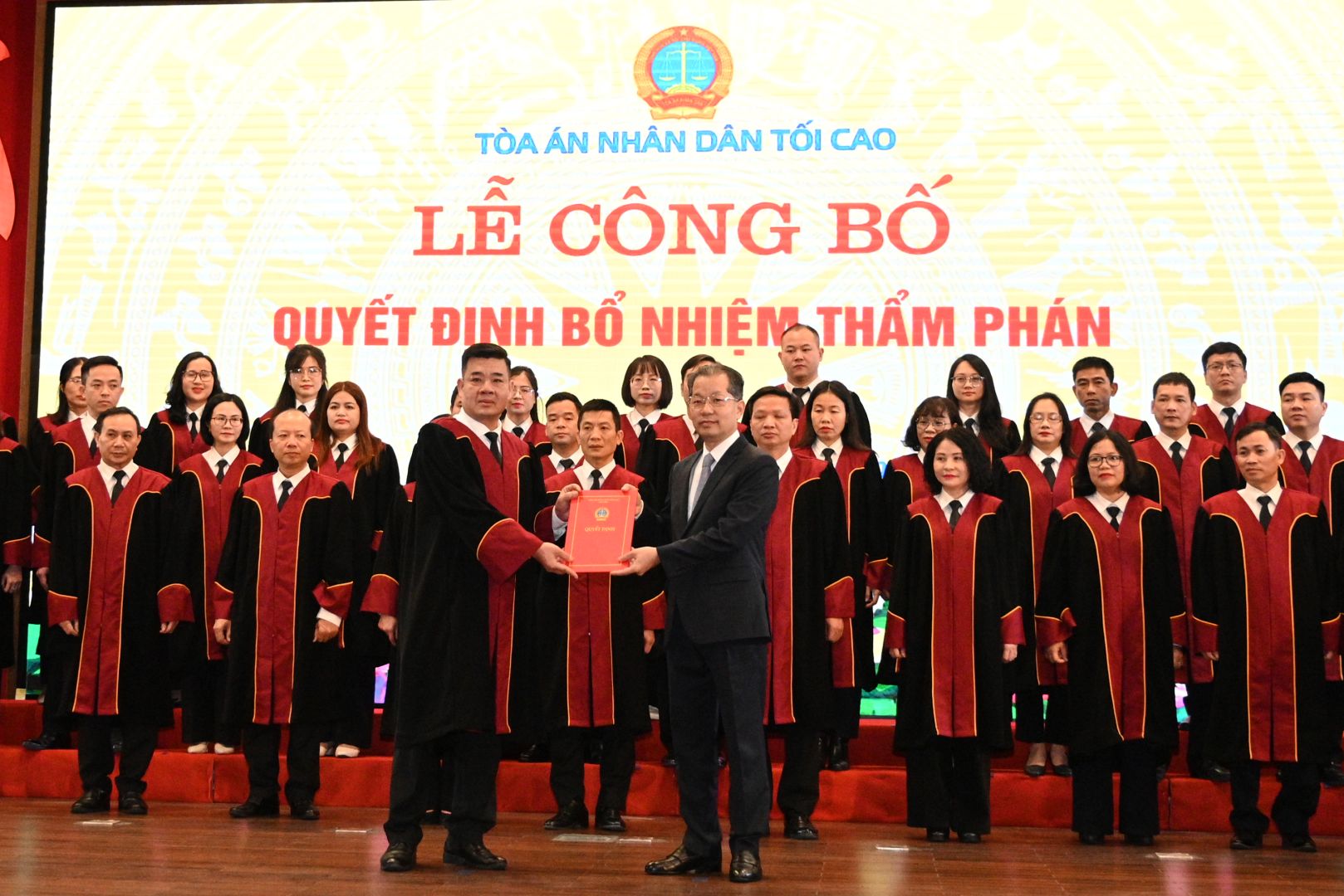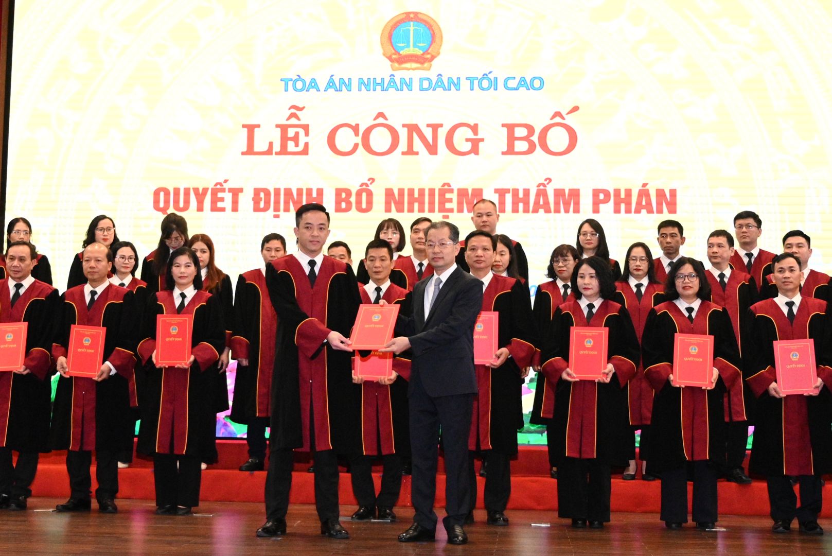 Sáng ngày 10/02, tại Hà Nội, Tòa án nhân dân tối cao tổ chức Lễ công bố Quyết định của Chủ tịch nước về việc bổ nhiệm Thẩm phán Tòa án nhân dân đối với 39 đồng chí là Thẩm tra viên cao cấp, Vụ trưởng, Phó Vụ trưởng, Thẩm tra viên chính và các chức danh có liên quan đang công tác tại các đơn vị thuộc Tòa án nhân dân tối cao.