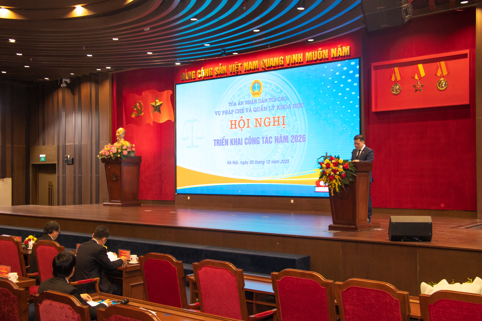 Chiều 30/12, Vụ Pháp chế và Quản lý khoa học Tòa án nhân dân tối cao (TANDTC) đã tổ chức Hội nghị triển khai công tác năm 2026. Đồng chí Nguyễn Văn Quảng, Ủy viên Trung ương Đảng, Bí thư Đảng ủy, Chánh án TANDTC dự và chỉ đạo hội nghị.