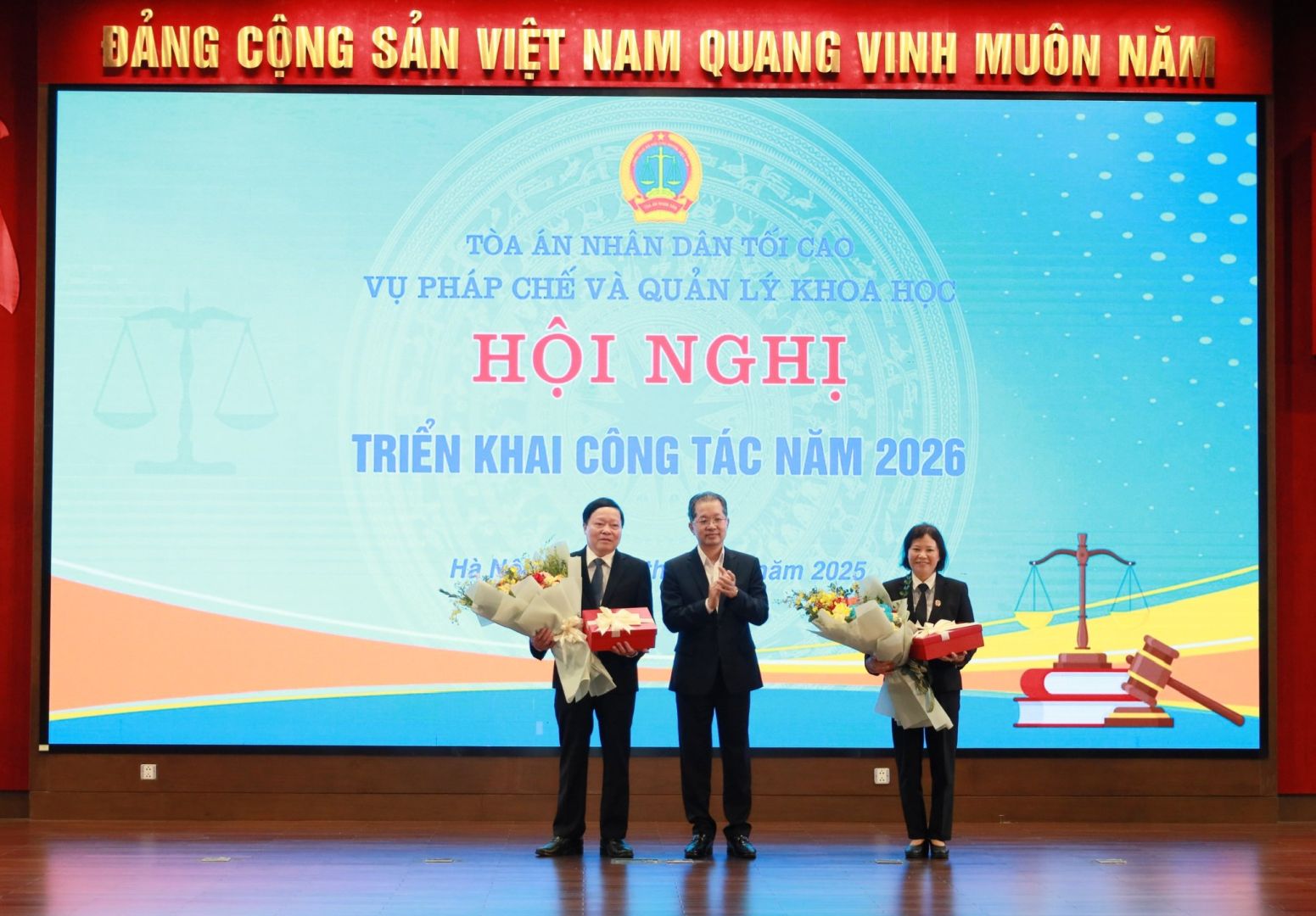 Theo đó, năm 2025 dưới sự lãnh đạo, chỉ đạo của Ban Thường vụ đảng ủy, lãnh đạo TANDTC, Vụ Pháp chế và Quản lý khoa học đã nỗ lực triển khai đồng bộ các nhiệm vụ được giao và đạt được nhiều kết quả tích cực. Qua đó, góp phần quan trọng vào công tác xây dựng hoàn thiện pháp luật, hướng dẫn áp dụng thống nhất pháp luật và cải cách tư pháp.